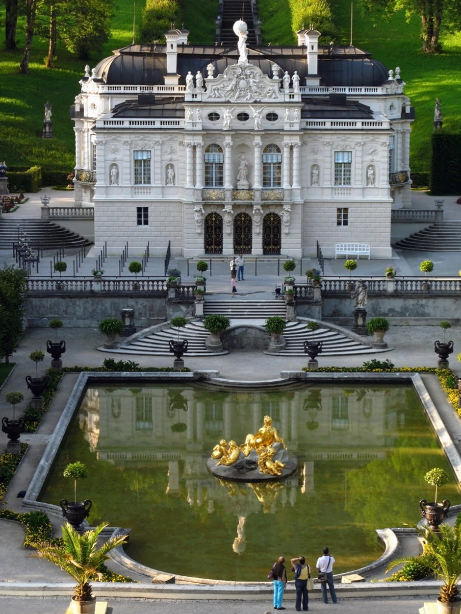 Dvorac Linderhof, „kraljevska vila“ Ludviga II, nekad je bio „lovačka kuća“ njegovog oca Maksimilijana II. Između 1870. i 1872. godine proširena je kompleksom zgrada u obliku slova „U“, u čijem se središtu nalazila „državna spavaća soba“. Novi deo je, kao i „lovačka kuća“, građen kao laka drvena konstrukcija. Tek je 1874. godine spoljašnja fasada obložena kamenom, a stara “lovačka kuća” je “preneta” u dvorski park. Na kraju su sagrađeni “Sala s ogledalima” i stepenište koji su ukrašeni u stilu novog rokokoa. Sobu s ogledalima kralj je naročito voleo. Pošto je imao običaj da spava preko dana, a noću ostane budan, vreme je provodio u ovoj sobi, uglavnom čitajući, često i po cele noći. Upaljene sveće čiji se plamen reflektuje preko velikog broja ogledala na njega su ostavljale očaravajući utisak.