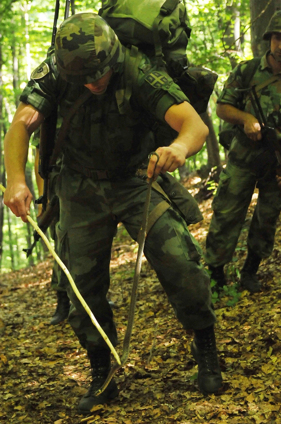 KRALJEVO - Da nismo bili tamo, pomislili bismo da je reč o nekom akcionom filmu. Desetina momaka pod punom ratnom opremom pojavila se niotkuda iz guste šume. Zastaju, gledaju pa nastavljaju. U trenu jedan od njih grabi granu i zmiju dugu više od metar, pribija je uz zemlju, hvata iza glave i smešta u vrećicu. I u najvećoj tišini jedinica nastavlja dalje.