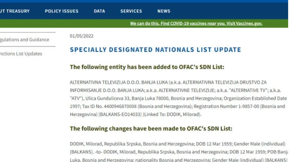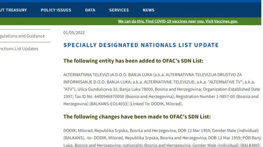 Ka ko je saopšteno iz Ministarstva finansija SAD-a, Alternativna televizija se na ovoj listi našla zbog povezanosti s Miloradom Dodikom, a iz SAD-a su objavili više detalja o povezanosti ovog medija s predsednikom SNSD-a.