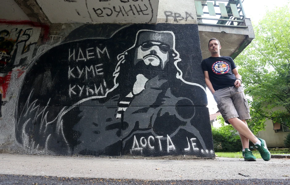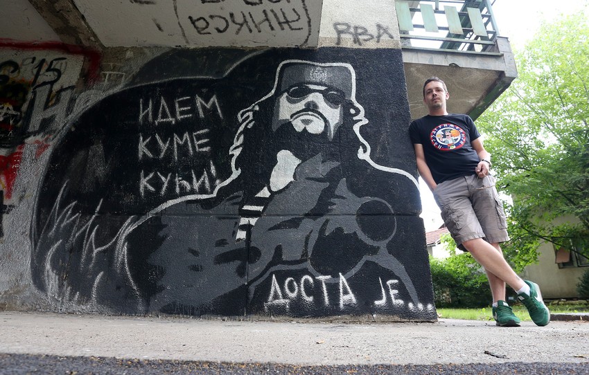 Odmah je, dodaje, znao da će pored portreta stajati citat „Idem kume kući! Dosta je...“ iz kultnog filma „Lepa sela, lepo gore“.