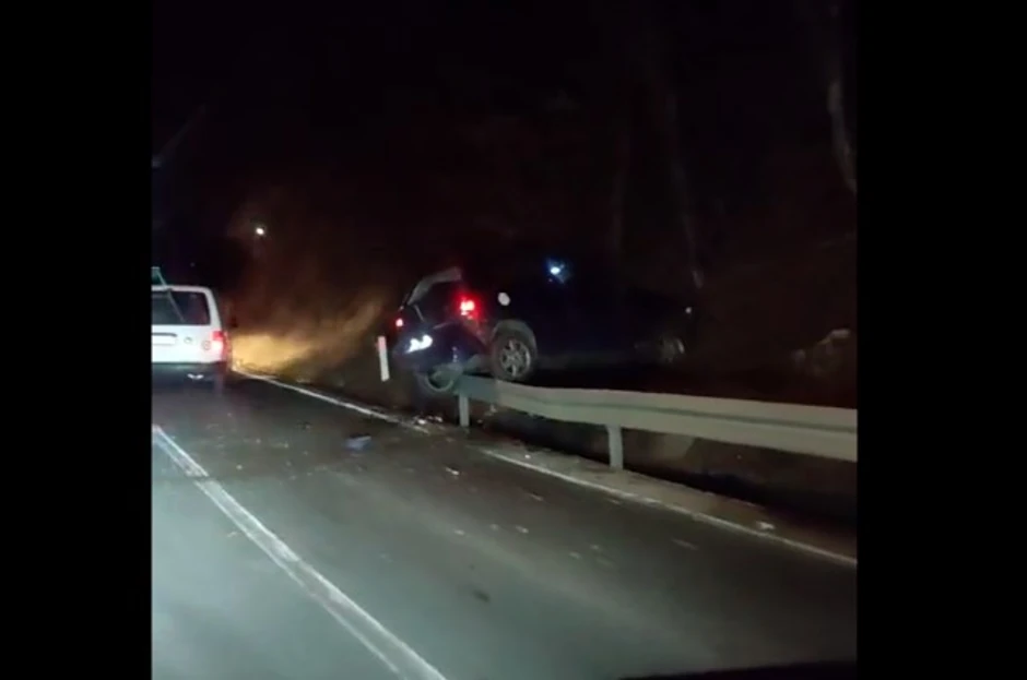 Na snimku se vidi i drugi automobil za koji se pretpostavlja da je udario u vozilo koje je završilo na zaštitnoj ogradi.
