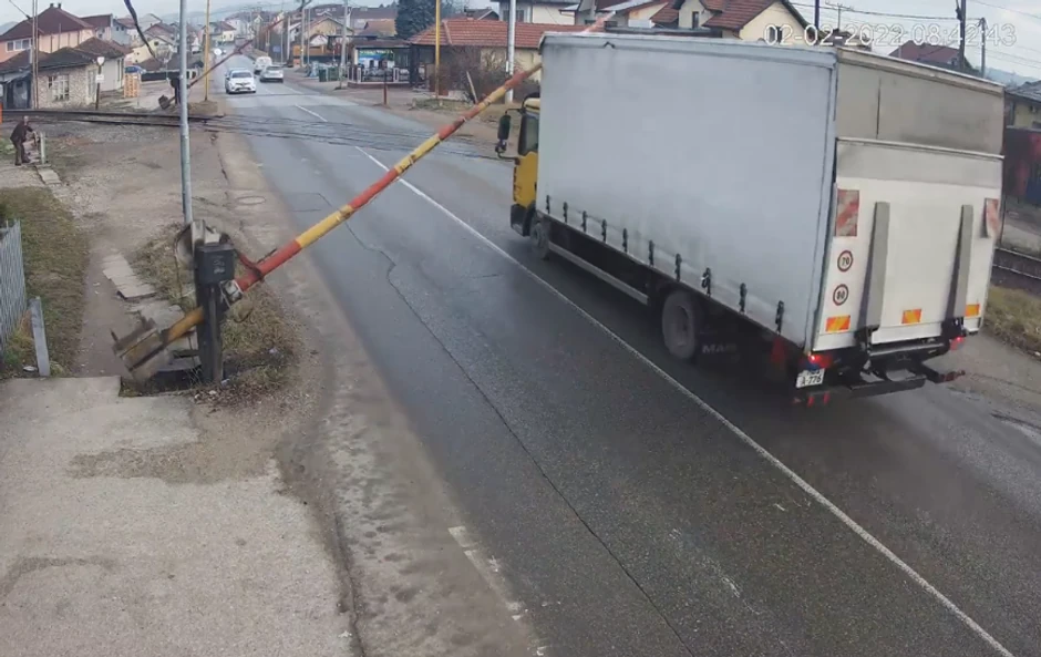 Na Fejsbuk strancici Železnica Republike Srpske objavljen je snimak sa pružnog prelaza “Zalužani” na kojem se vidi kako se vozač kamiona ne zaustavlja na svetlosne signale upozorenja i kako kamionom otkida rampu.