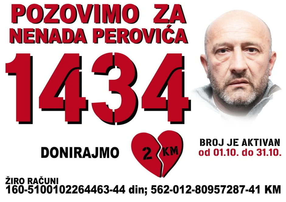 Do kraja oktobra pozivom na humanitarni broj "M:tela" 1434 možete donirati 1 evro za lečenje Nenada Perovića.