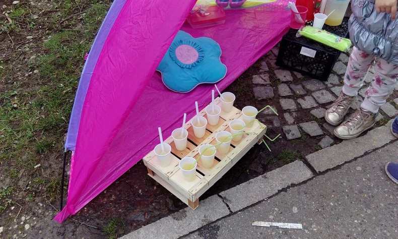 Zavisno od želje, za simboličan iznos od pola marke ili marku možete kupiti slabiju ili jaču limunadu, osvežiti se i pomoći ovim vrednim devojčicama da zarade džeparac.