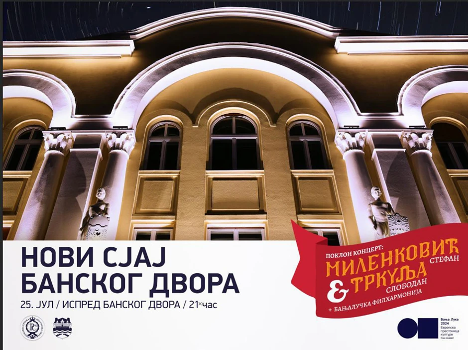 Povodom završetka obnove Banskog dvora, na platou ispred ove kulturne ustanove u četvrtak, 25. jula biće održan koncert proslavljenih umetnika Stefana Milenkovića i Slobodana Trkulje, uz pratnju simfonijskog orkestra Banjalučke filharmonije.