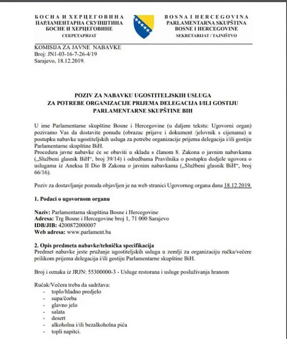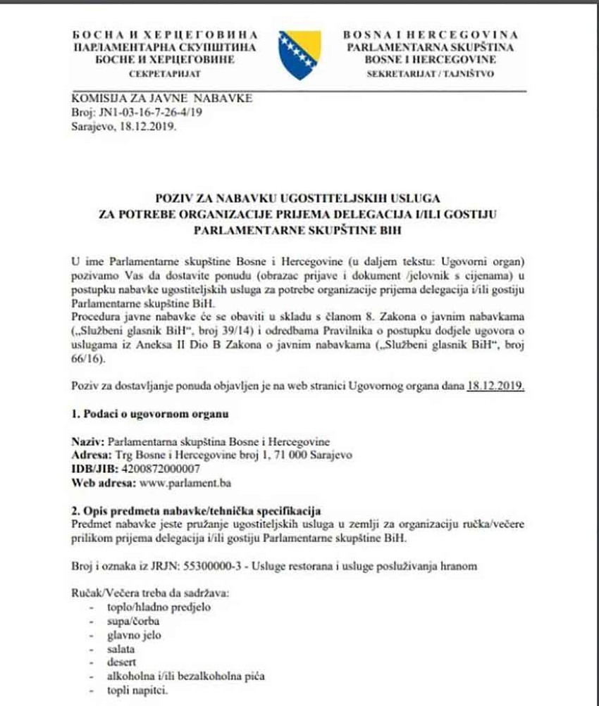 U ime Parlamentarne skupštine Bosne i Hercegovine, Komisija za javne nabavke uputila je poziv za dostavljanja ponuda u postupku nabavke ugostiteljskih usluga za potrebe organizacije prijema delegacija i gostiju parlamenta.