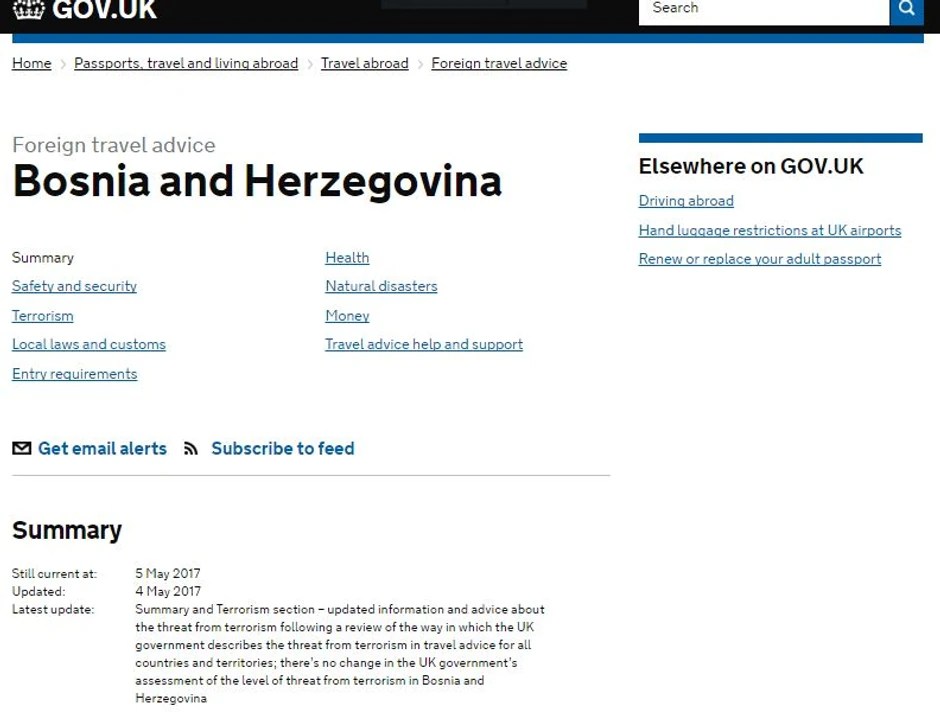 U upozorenju, koje je izdato budući da BiH svake godine poseti 9.000 Britanaca, napominje se da su se u toj zemlji 2015. godine desila dva teroistička napada - 27. aprila u Zvorniku, gde je ubijen jedan policajac, a dva ranjena i 18. novembra 2015. godine u sportskoj kladionici u Rajlovcu u blizini Sarajeva kada su usmrćena dvojicu pripadnika Oružanih snaga BiH, a tri lica ranjena.