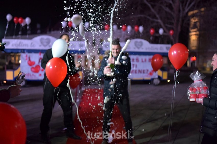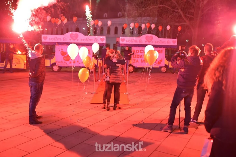 Zanimljivoj i nesvakidašnjoj veridbi svedočili su sugrađani koji su se večeras zatekli na Trgu slobode u Tuzli.