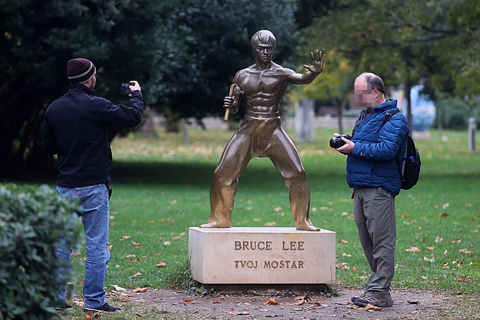 Statua Brusa Lija u Mostaru opremljena je zaštitnom maskom i rukavicama, a na Instragram stranici posvećenoj tom majstoru borilačkih veština navedeno je da je on tako ponovo postao simbol borbe, ovog puta protiv korona virusa.
