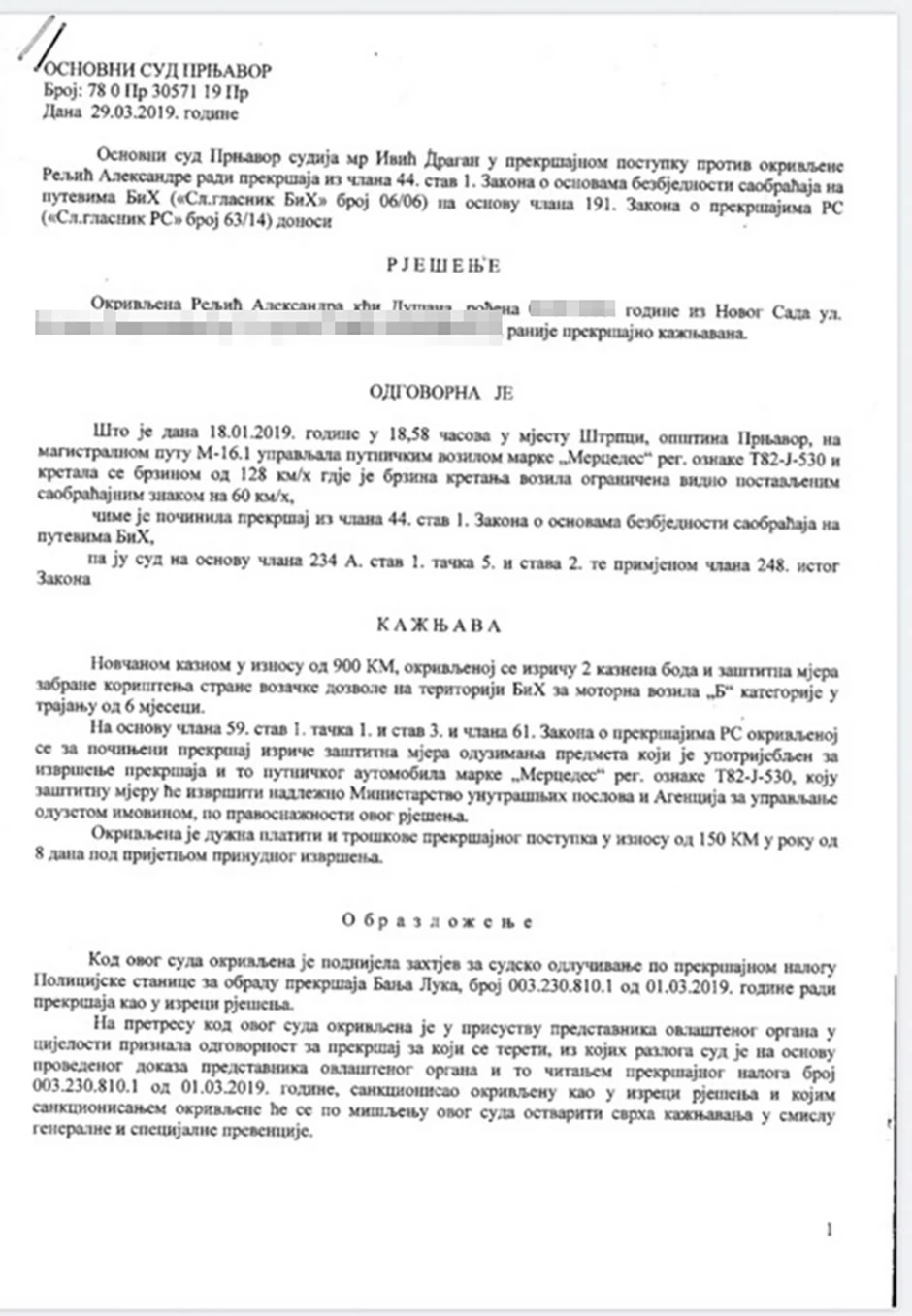 Sagovornik Srpskainfo ističe da joj je saobraćajna policija napisala dosta manju kaznu, ali da je ona odbila da plati. Međutim, na kraju se grdno pokajala jer se postupak vodio pred jedinim Osnovnim sudom u Republici Srpskoj koji oduzima vozila bezobzirnim vozačima.