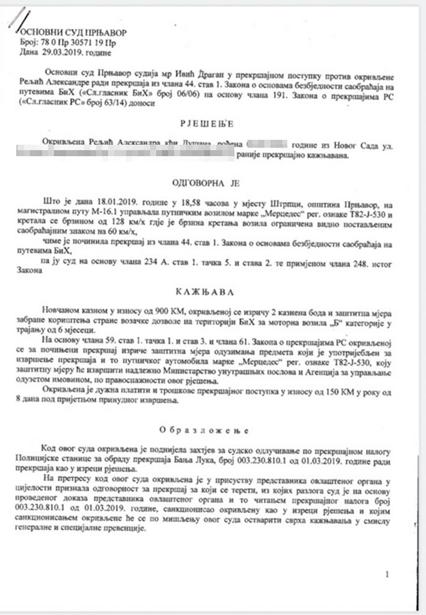 Aleksandra je bez vozila ostala zbog divljačke vožnje sredinom januara ove godine na području Prnjavora. Policija ju je zaustavila u selu Štrpci kod Prnjavora, jer je vozila čak 128, na delu puta gde je ograničenje 60 kilometara na čas.
