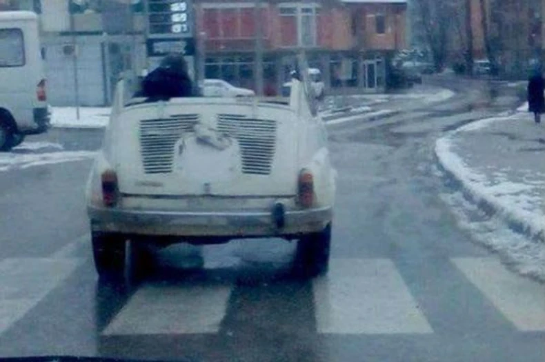 Interesantno je to da je „fićo“ ostao bez krova, a vozač ga s ponosom vozi uprkos tome, što je u vreme kada je ova fotografija nastala na ulicama Foče bilo snega. Pretpostavljamo da je bilo i hladno.