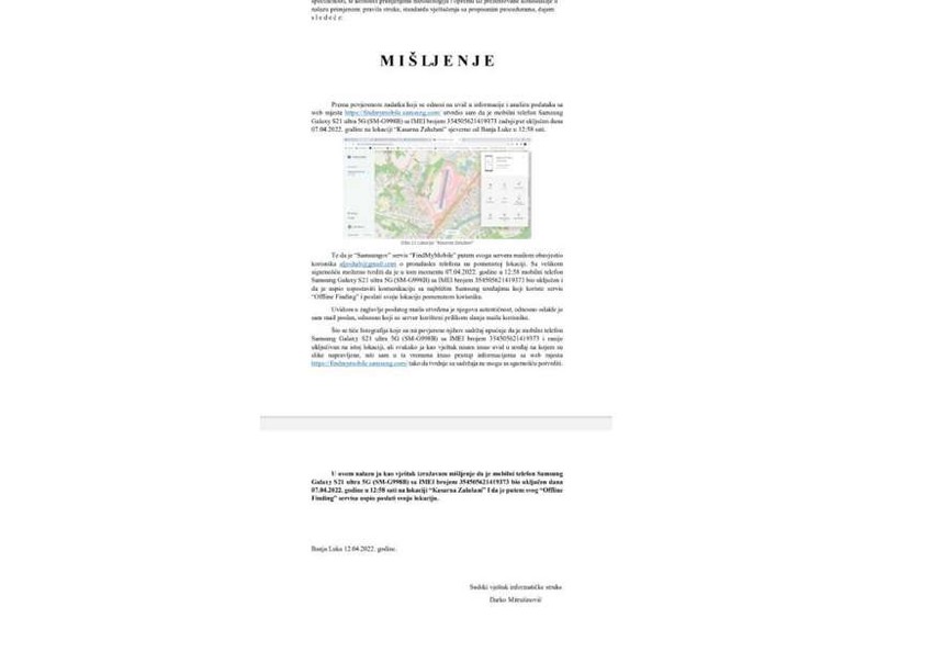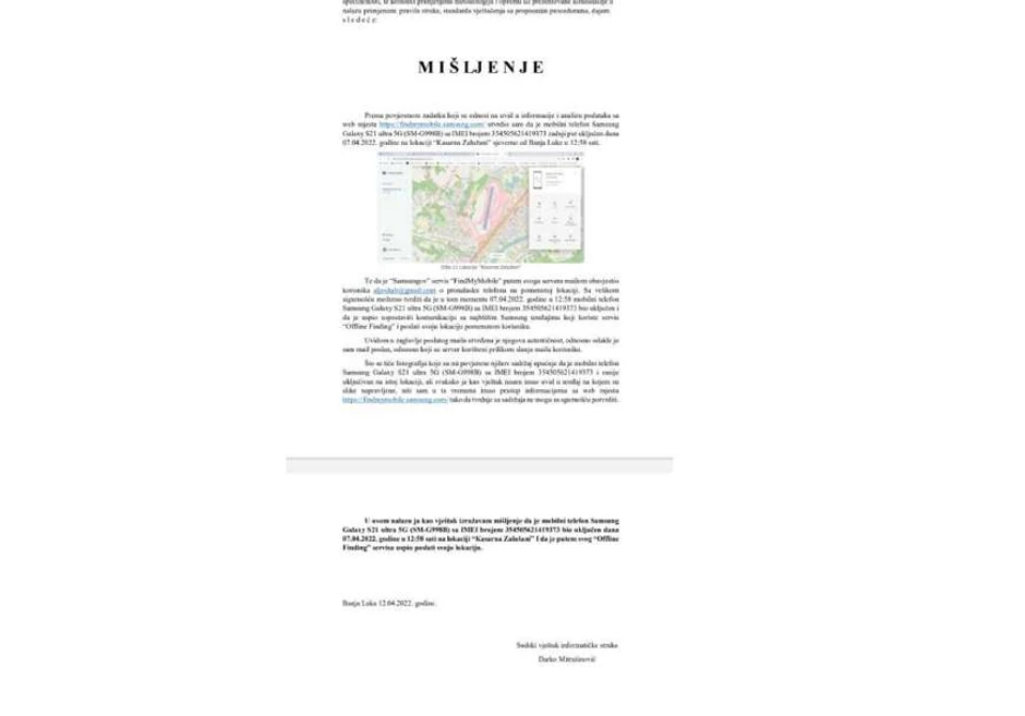 Prema poverenom zadatku koji se odnosi na uvid u informacije i analizu podataka sa web mesta utvrdio sam da je mobilni telefon Samsung Galaxy S21 ultra 5G zadnji put uključen 7. aprila na lokaciji “Kasarna Zalužani” u 12.58. Samsungov servis je putem svog servera mejlom obavestio korisnika o pronalasku telefona na pomenutoj lokaciji, naveo je veštak informatičke struke Mitrašinović.