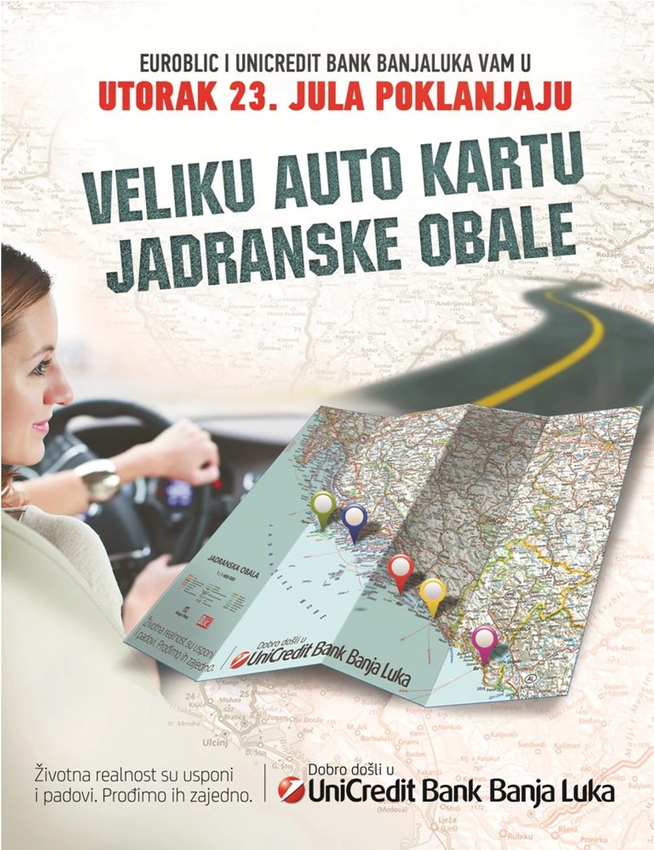 “Euroblic” i “UniCredit bank Banjaluka” u utorak 23. jula svim čitaocima poklanjaju veliku auto kartu Jadranske obale.