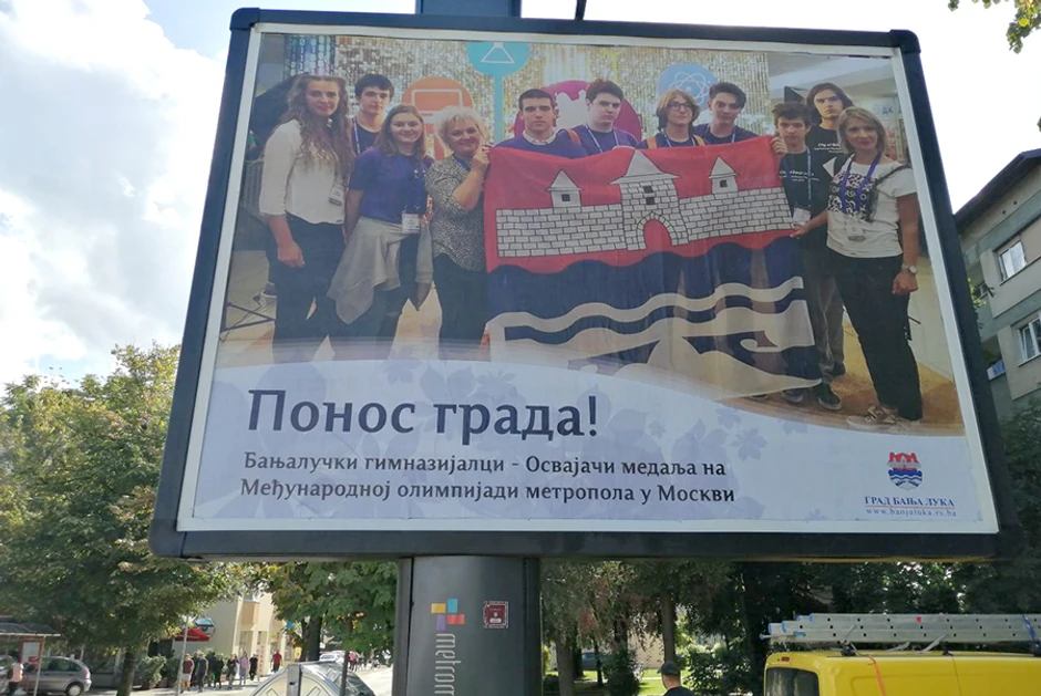 Na više lokacija u Banjaluci danas su postavljeni bilbordi s natpisom „Ponos grada“, u znak zahvalnosti učenicima banjalučke gimnazije koji su ostvarili zapažen uspeh na prestižnom međunarodnom takmičenju iz prirodnih nauka u Moksvi.