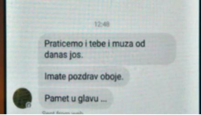 U policijskoj stanici Srebrenica potvrđeno je da je prijavljen slučaj pretnji putem poruke “Pratićemo tebe i muža od danas još... Imate pozdrav... Pamet u glavu”.