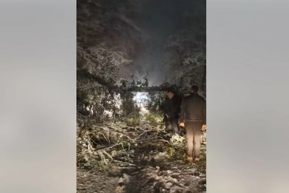 Sneg intenzivno pada, što dodatno otežava uslove za vožnju, ali i rad ekipa na terenu koje pokušavaju ukloniti drveće i osposobiti put za saobraćaj, pišu Nezavisne.