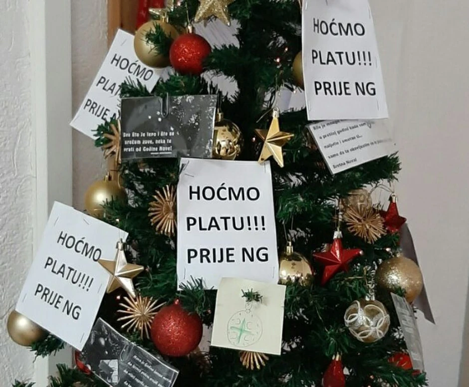 Nezadovoljni radnici Zavoda za fizikalnu medicinu „Dr Miroslav Zotović“ u Banjaluci tokom proteklog vikenda na jelki u sali za vežbanje, okačili su "transparente" kojim su poručili da traže platu pre Nove godine.