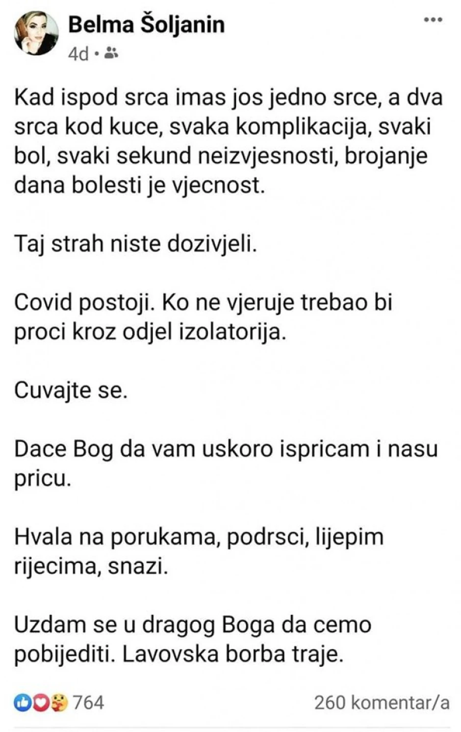 - Kada ispod srca imaš još jedno srce, a dva srca kod kuće, svaka komplikacija, svaki bol, svaki sekund neizvesnosti, brojanje dana bolesti je večnost. Taj strah niste doživeli. Kovid postoji. Ko ne veruje treblo bi da prođe kroz odeljenje izolacije - napisala je ona.