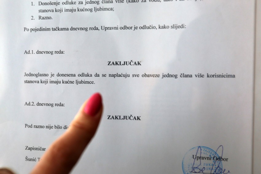 Odluka o tome da se naplaćuju sve obaveze jednog člana više korisnicima stanova koji imaju kućne ljubimce, po kojoj stanar za psa plaća dodatnih šest KM za vodu i pola marke za struju, odnosno lift, dočekala je stanare u banjalučkoj Beogradskoj ulici na ulazu broj 13.