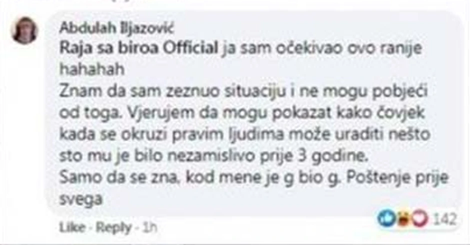 - Znam da sam zeznuo situaciju i ne mogu bobeći od toga. Verujem da mogu pokazati kako čovek kada se okruži pravim ljudima može uraditi nešto što mu je bilo nezamislivo pre tri godine. Samo da se zna, kog mene je g. bio g. (gram bio gram). Poštenje pre svega - naveo je on u jednom od komentara, odgovaravšui na prozivku o svojoj prošlosti.