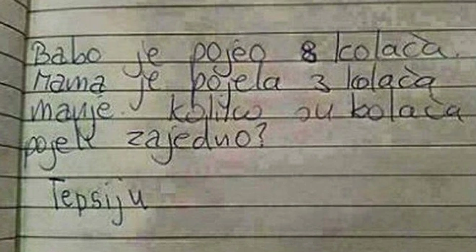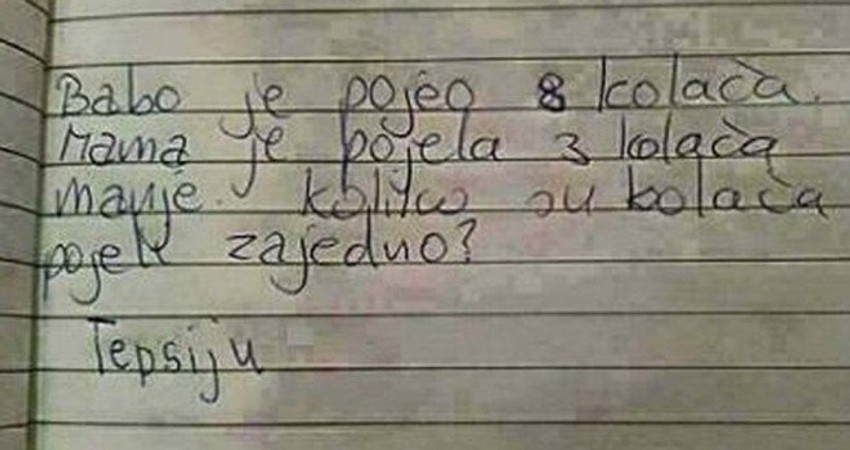 Uglavnom, za zadatak je trebalo izračunati, koliko su majka i otac kolača pojeli, prema zadanim brojevima. Ali, očito je klinac umesto matematičke, iskoristio logiku iz domaćinstva, pa je rekao da su u zbiru njegovi roditelji pojeli - tepsiju kolača!