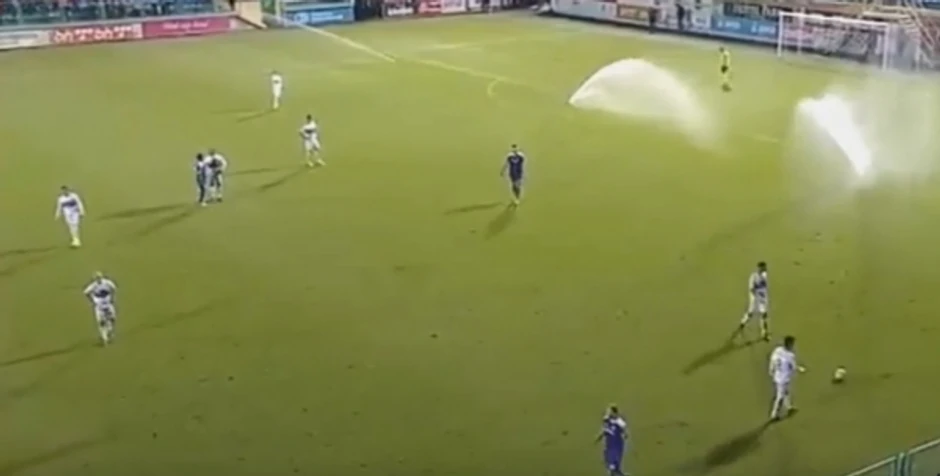 Kasnije, u 75. minuti prskalice koje navodnjavaju stadion iznenadno su se aktivirale na polovini gde se nalazio gol Željezničara.
