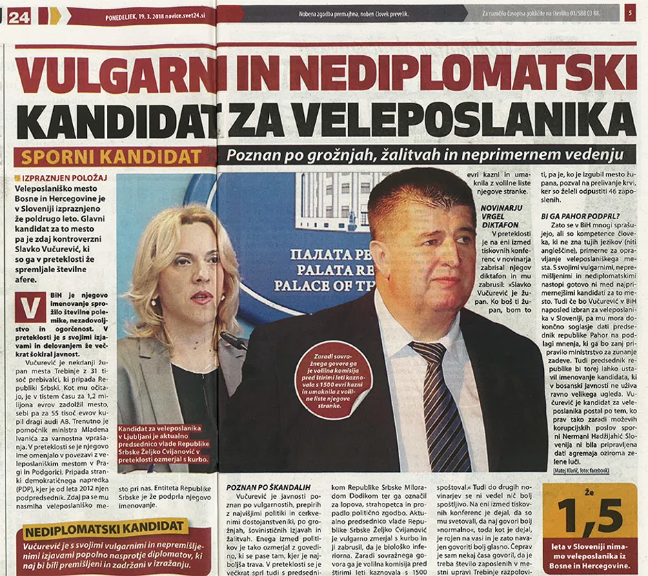Kandidatura Slavka Vučurevića, bivšeg gradonačelnika Trebinja, za novog ambasadora BiH u Sloveniji izazvala je pažnju i slovenačkih medija.