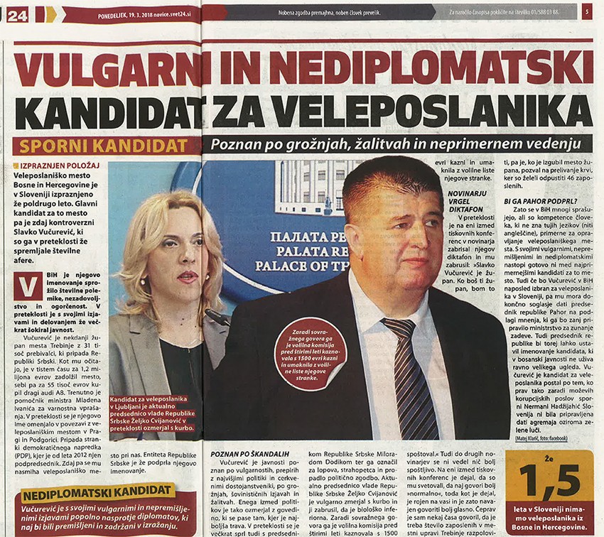 Priča o njegovom mogućem imenovanju na tu poziciju osvanula je čak i na naslovnoj strani jednog od tamošnjih listova, i to pod naslovom „Kralj skandala ambasador u Sloveniji“.