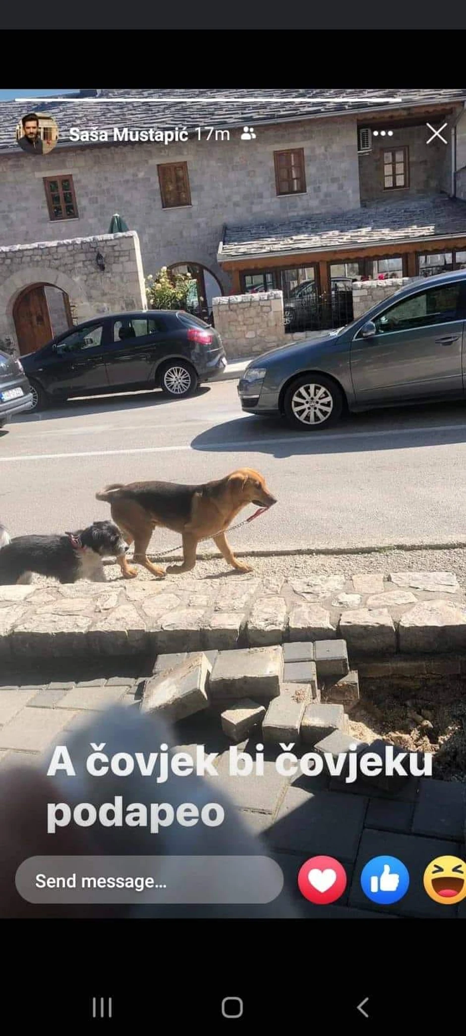 "Skoro svaki dan pustimo Bellu da prošeta po čaršiji. Ona je vakcinisana i sterilisana, pa se ne sekiramo puno. Nakon što malo prošeta vrati se kući. Juče ju je pustila mama, ali joj nije skinula povodac. Bella je otišla svom prijatelju, inače sinu od kuje koja je kod nas na Gorici, koji je jedini iz legla ostao na ulici. Sad je jasno da su njih dvoje par. Jasno je koliko uživaju jedno u drugome. Ovo vodanje je kao da se drže za ruke. Bellu je ispratio kući. Momak joj je još uvek na ulici.", napisao je Demir Mahmutčehajić.
