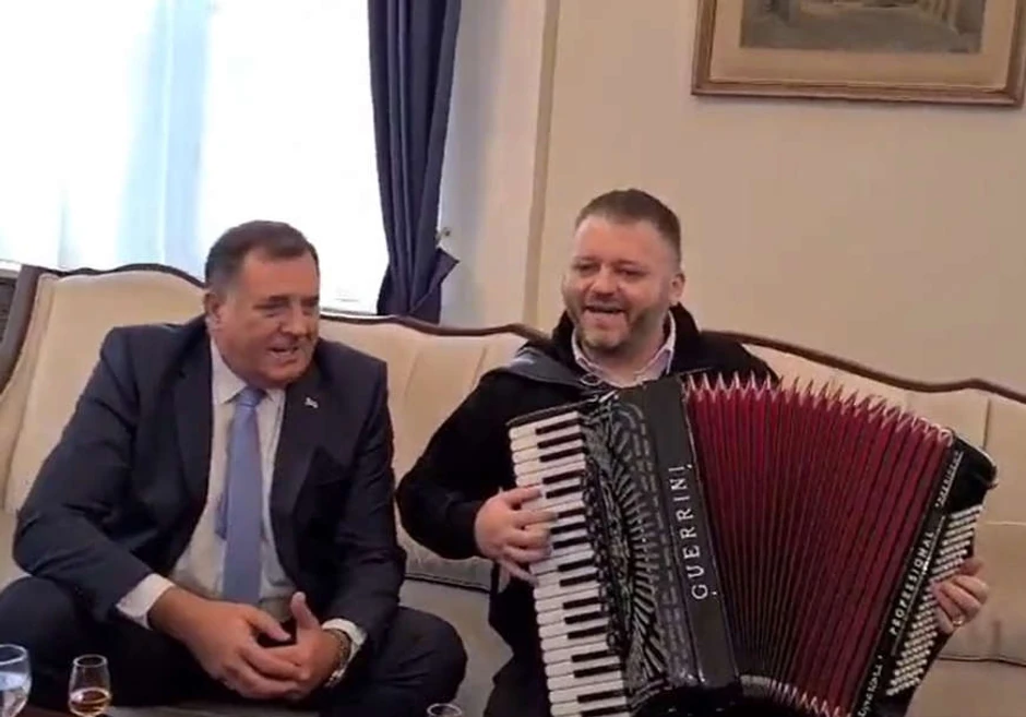 Nastup veselog haromonikaša u kabinetu člana Predsedništva BiH Milorada Dodika izazvao je danas lavinu komentara.