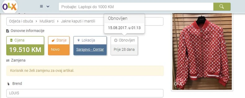 Tako je na OLX.ba pre skoro mesec dana objavljen oglas putem kojeg jedan Sarajlija prodaje Luj Viton suprem crvenu kožnu jaknu.