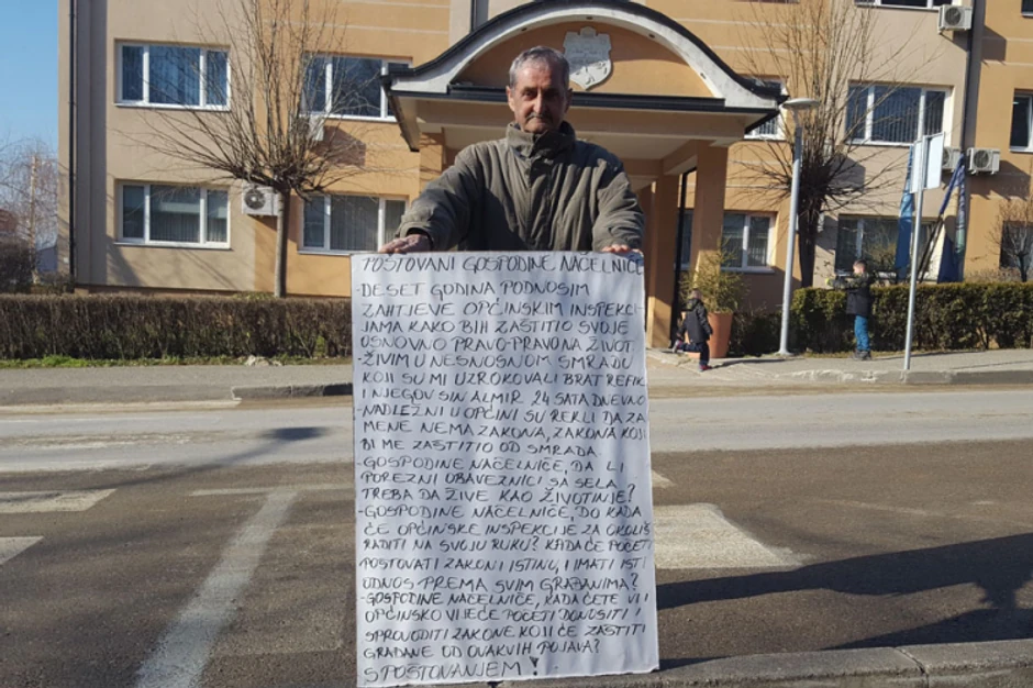 Već nekoliko dana dolazi pred zgradu lokalne administracije u Velikoj Kladuši s transparentom na kojem je, kako kaže, napisao sve što ga tišti i na šta je u nebrojeno navrata upozoravao nadležne organe.