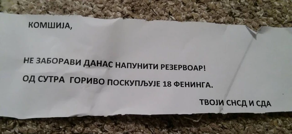 U porukama zakačenim za brisače ispisano je "Komšija, ne zaboravi danas napuniti rezervoar! Od sutra gorivo poskupljuje 18 pfeninga" - stoji u poruci koja je ironično potpisana "Tvoji SNSD i SDA".