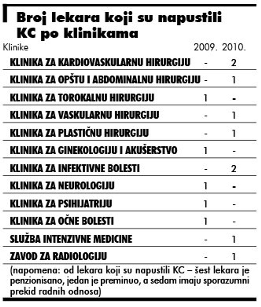 Banjaluka - U prvoj polovini ove godine najveću zdravstvenu ustanovu u RS, Klinički centar Banjaluka, napustilo je osam lekara, dok je lane KC ostao još bez šestorice doktora, podaci su iz Kliničkog centra. Trenutno ova zdravstvena ustanova ima 436 lekara, a prema tvrdnjama Strukovnog sindikata doktora medicine RS, Kliničkom centru nedostaju još 44 lekara da bi zdravstveni sistem normalno funkcionisao. Problem je i što su KC napustili lekari za složenije zahvate, a rukovodstvo ove ustanove izdvaja popriličnu sumu novca za dodatno usavršavanje lekara.