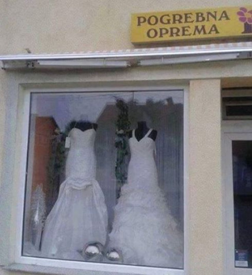Naime, iznad prodavnice venčanica, koje po starim dobrim običajima, devojke oblače na dan kada sa izabranikom svoga srca pristaju da žive do kraja života, u dobu i zlu, velikim slovima piše: „POGREBNA OPREMA“.