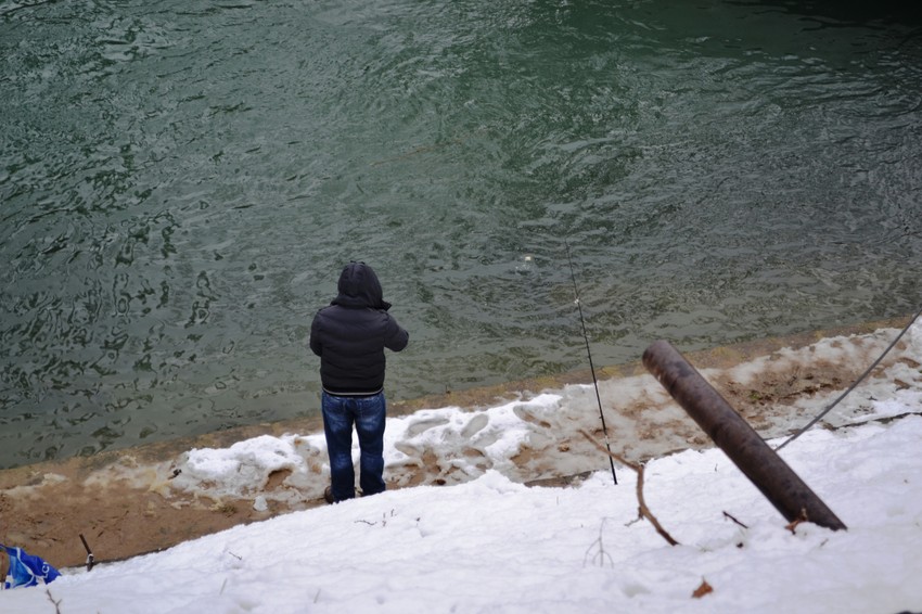 Niska temperatura i sneg u Banjaluci nisu sprečili pojedine lokalne ribolovce da okušaju sreću, pecajući u Vrbasu.