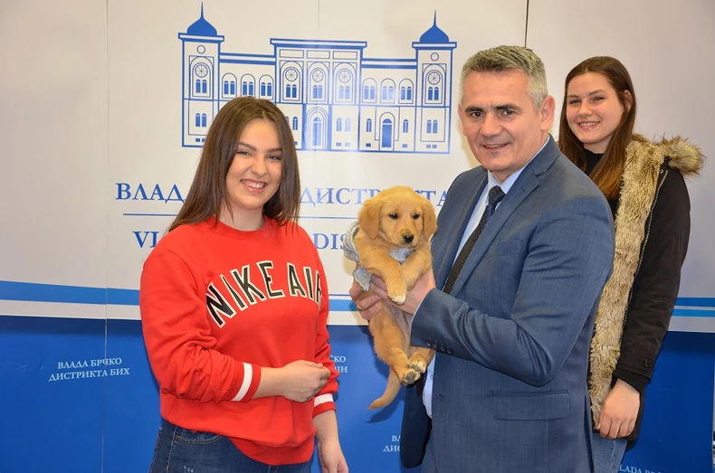 Helena Radić i Katarina Karać, učenice trećeg razreda JU Poljoprivredna i medicinska škola iz Brčkog danas su, povodom osmog marta, Dana Brčko distrikta poklonile gradonačelniku Siniši Miliću štene zlatnog retrivera.