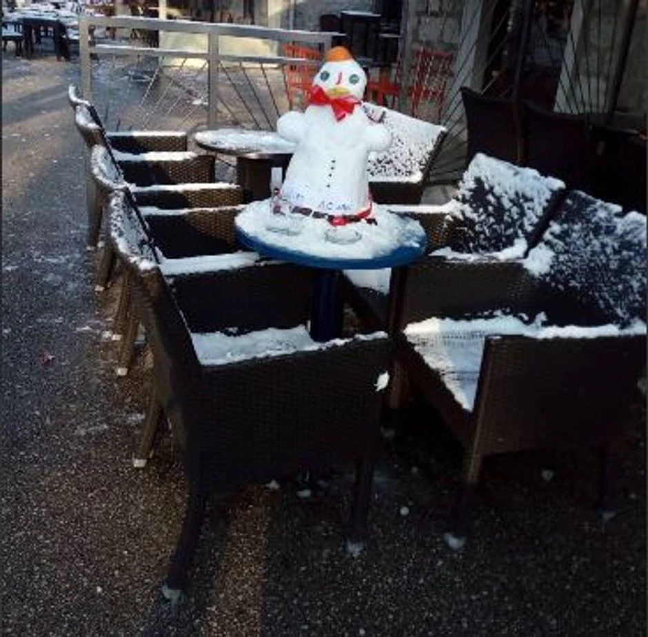 Na jednom od stolova dovitljivi ugostitelji su napravili Sneška, ispod koga su stavili natpis „Dobro došli“, a tu su i šoljice, čase, šećer sa reklamom objekta i pepeljara.