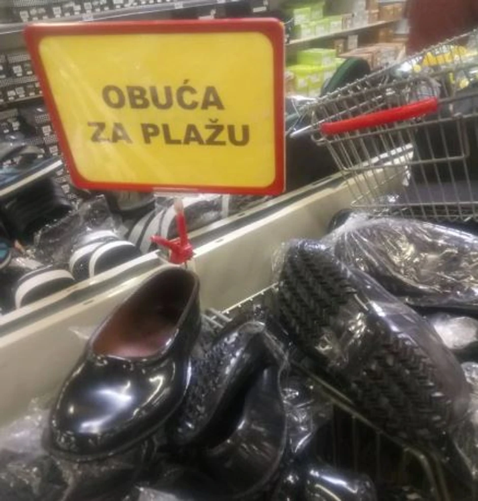 U jednom od tržnih centara u Sarajevu zabeležena je fotografija na kojoj su u modne dodatke za plažu svrtani i gumeni opanci.