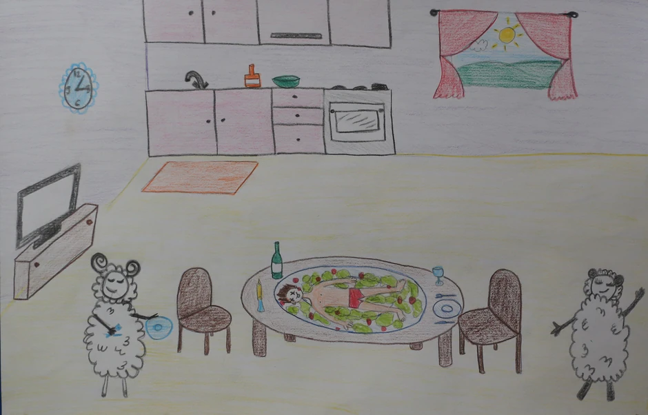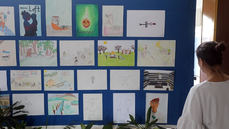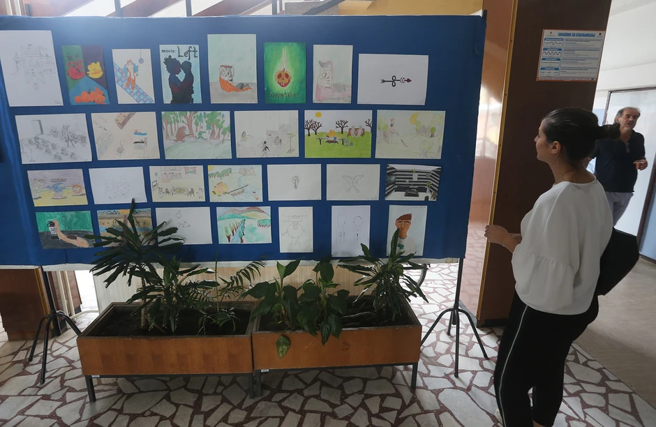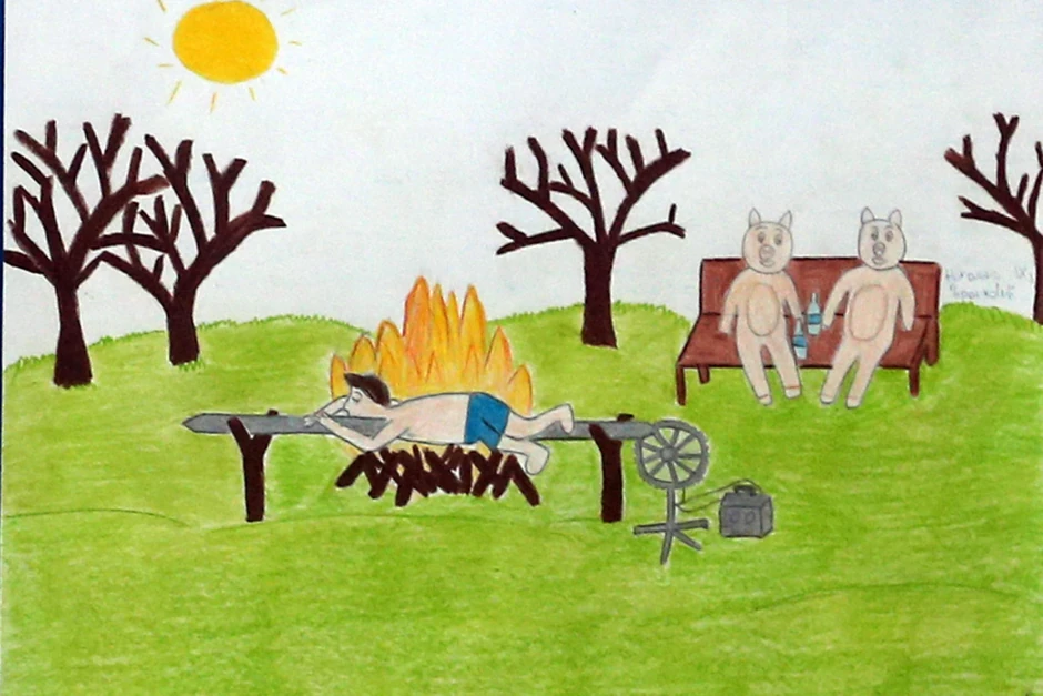 U holu OŠ „Sveti Sava“ u Banjaluci izloženi su crteži na kojima svinje peku ljude na ražnju, lisica nosi čovečje krzno, ribe na udici drže čoveka, a majmuni posmatraju ljude u kavezu.