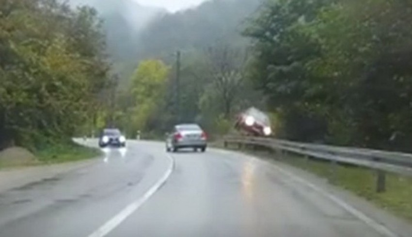 Tako se juče na društvenim mrežama pojavio video snimak automobila kako leti preko bankine.