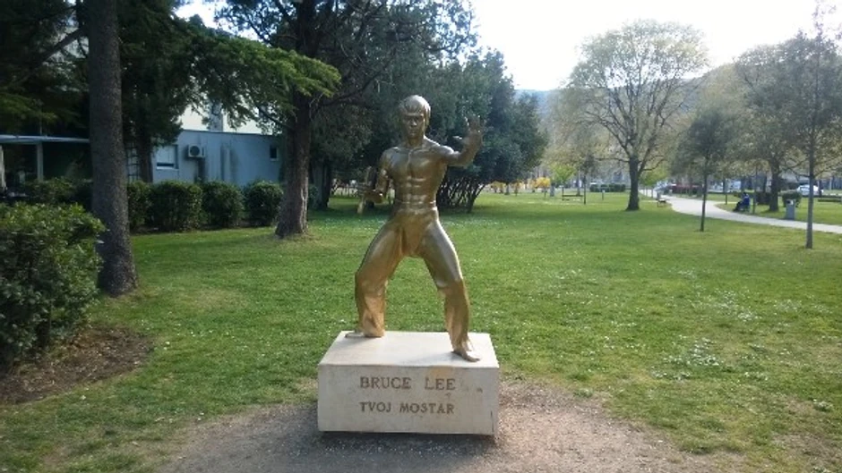 Prvi posleratni spomenik koji je u BiH izazvao medijsku buru bio je Brus Li, izvajan u zlatnoj boji i prirodnoj veličini i postavljen krajem 2005. na Španski trg u Mostaru.