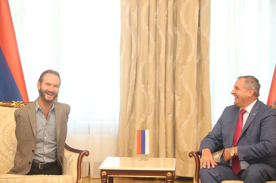 Poznati humanista i motivacioni govornik Nik Vujičić sastao se danas sa zvaničnicima Republike Srpske. Nika Vujičića ugostio je predsednik Vlade Republike Srpske Radovan Višković, kao i srpski član Predsedništva BiH Milorad Dodik.