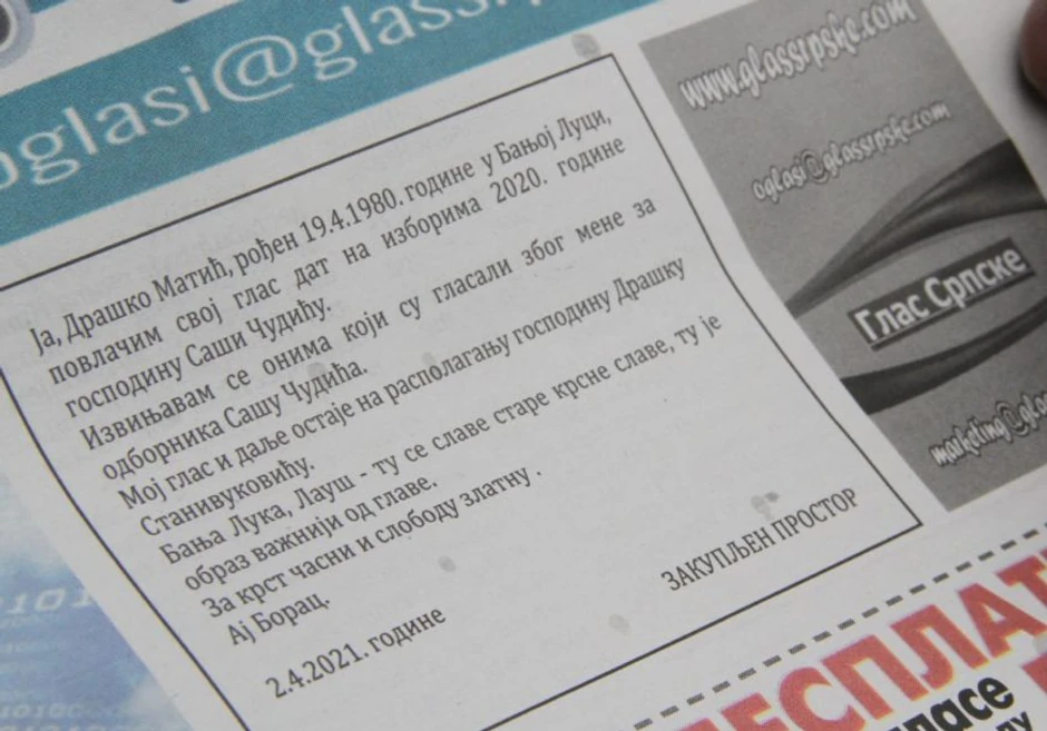 - Ja, Draško Matić, rođen 19.04.1980. godine u Banjaluci, povlačim svoj glas dat na izborima 2020. godine gospodinu Saši Čudiću – ovako započinje oglas Banjalučanin, nakon čega je usledio izvinjenje sugrađanima koji su pod njegovim uticajem ukazali poverenje Čudiću.