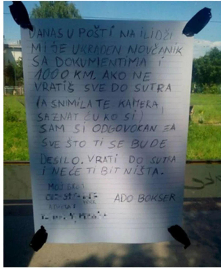 – Danas u pošti na Ilidži mi je ukraden novčanik s dokumentima i 1.000 KM. Ako ne vratiš sve do sutra, a snimila te kamera, saznaću ko si, sam si odgovoran za sve što ti se bude desilo. Vrati do sutra i neće ti biti ništa – stoji u poruci, piše espreso.