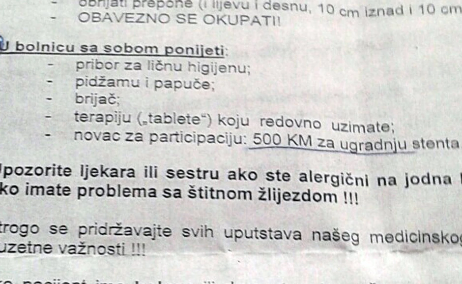 – U njemu je navedeno šta sve od dokumentacije treba da donesem, za prijem na odeljenje interventne kardiologije radi ugradnje stenta. U okviru stavke “u bolnicu sa sobom poneti”, između ostalog je navedeno da treba da donesem i 500 KM, kao participaciju za ugradnju stenta. Stvarno sam se neprijatno iznenadila, jer je kolegica radila ovu intervenciju i nije platila toliko – kaže naša sagovornica.