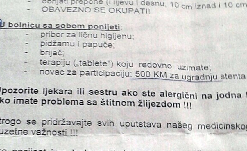 Tako pacijentima kojima je zakazana ova intervencija, šalju obaveštenja u kojem, u okviru stavki šta im sve od dokumentacije treba za prijem na odeljenje, između ostalog stoji da u bolnicu sa sobom donesu i "novac za participaciju: 500 KM za ugradnju stenta".