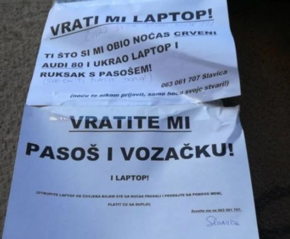 - Vrati mi laptop. Ti što si mi obio noćas crveni audi 80 i ukrao laptop i ruksak s pasošem, neću te nikom prijaviti samo hoću svoje stvari. Vratite mi pasoš i vozačku i laptop. Otkupite laptop od čoveka kojem ste ga noćas prodali i prodajte ga ponovo meni, platiću ga duplo – piše u poruci ispod koje se potpisala Slavica.