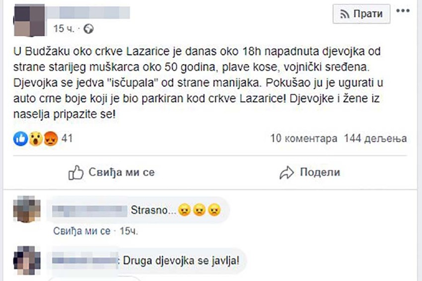 – Prišao joj je stariji muškarac, oko 50 godina i plave kose. Devojka se jedva uspela izvući pobeći. Pokušao ju je ugurati u automobil crne boje, koji je bio parkiran kod crkve Lazarice – navedeno je u ovom statusu.